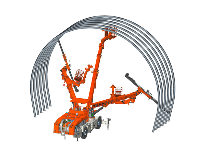 雙鑿巖拱錨臺車融合拱架施工與錨桿施工為一體,適應各種規格鋼拱架安裝、錨桿施工、輔助裝藥平臺、輔助撬毛和通風管作業等多功能,滿足在鐵路、公路隧道內安裝單榀/多榀鋼拱架的規范性及安全性要求,滿足單洞單線、雙線、三線單次開挖(全斷面、臺階法)一次性鋼拱架安裝距離要求。